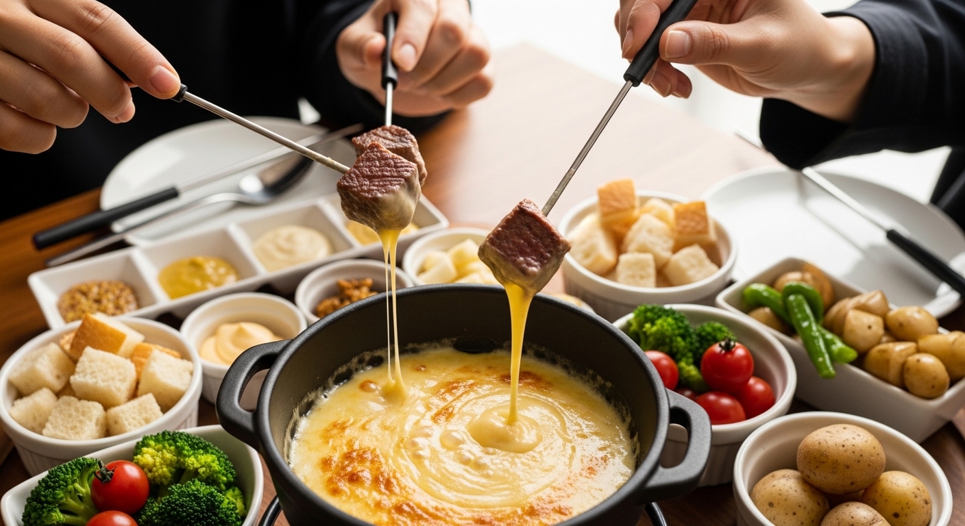• チーズフォンデュのテーブル写真は、真上からの俯瞰で「鍋を中心+具材を円形に配置」すると、SNS向きの整理された画になります。