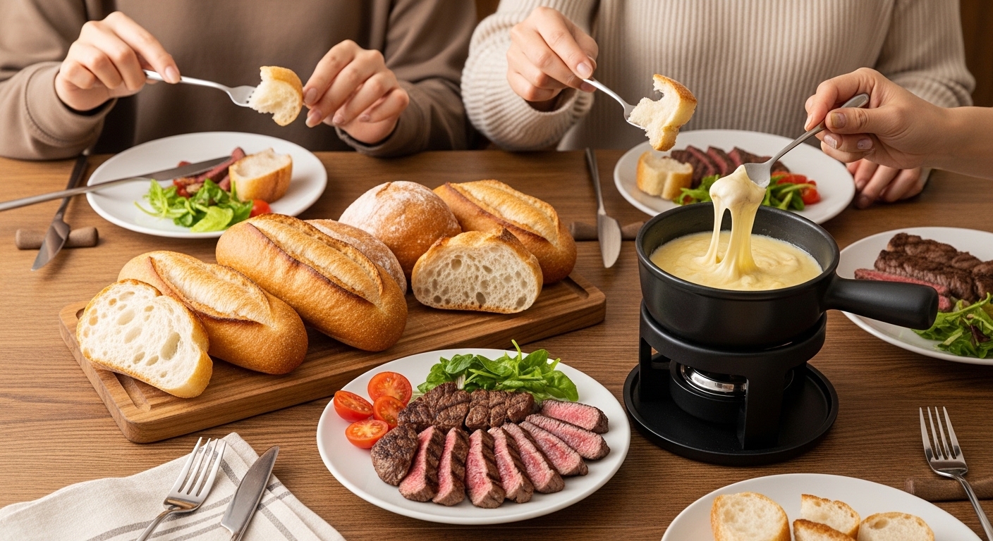 ステーキとチーズフォンデュを楽しむなら、パンは「硬めのクラスト・もちもちした中身・香ばしさ」の3要素を優先しましょう。