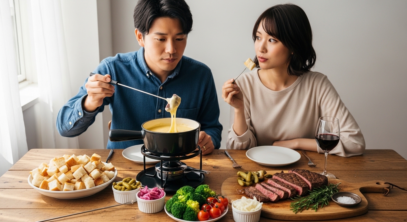 現実的な判断としては、コース料理の流れ(軽い前菜→メイン→デザート)を参考にしつつ、チーズフォンデュを「前菜寄りのメイン」、ステーキを「締めのメイン」と考えると、自然な味の構成になります。