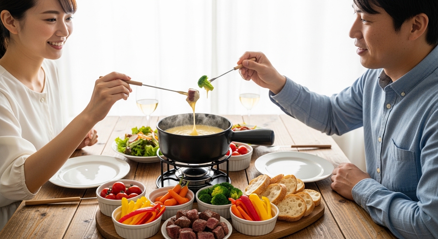 - チーズフォンデュは専用鍋または小鍋で温め、テーブル中央へ。