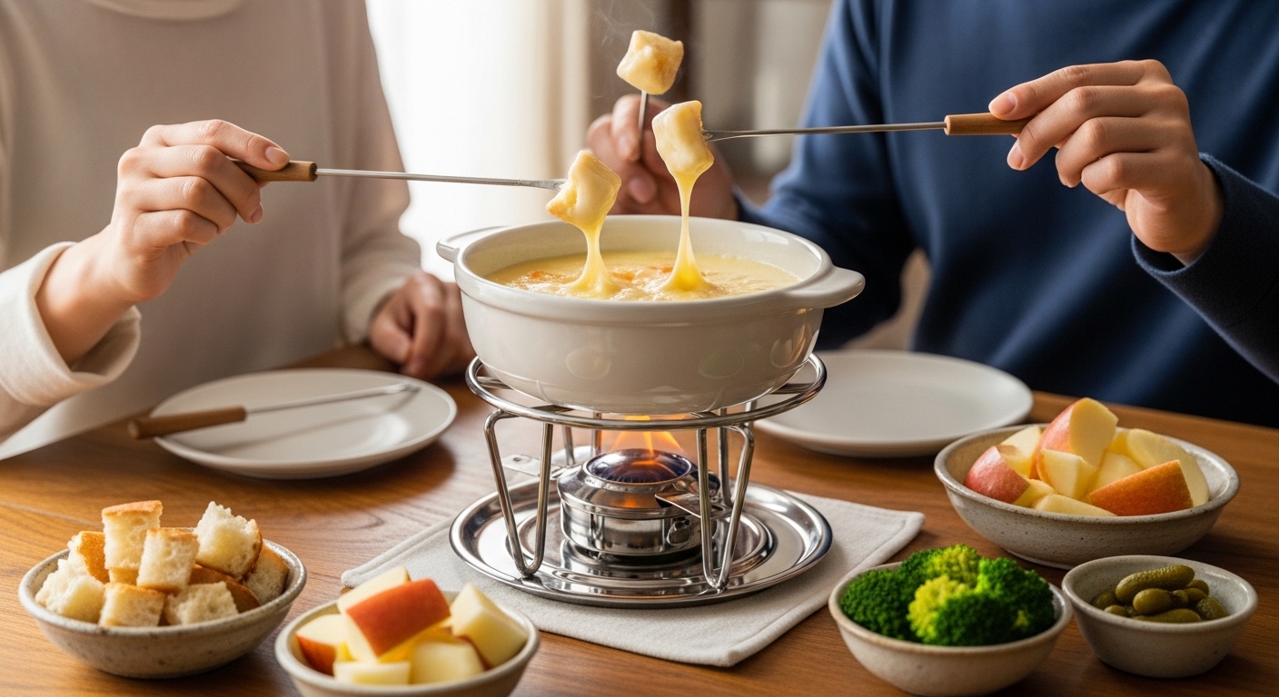 チーズフォンデュが「熱いほど良い」料理ではないということを理解することが大切です。一般的に、チーズは60〜70℃前後でよく伸び、とろみも安定しやすい性質があります。鍋の表面がグツグツ煮立つようなら温度が高すぎるサインで、火を弱めたり、一度火から外して落ち着かせるほうがなめらかさをキープしやすくなります。逆に、表面がまったく動かず、具材をつけたときに「ドロッ」と重くなってきたら、保温温度が低すぎる合図です。