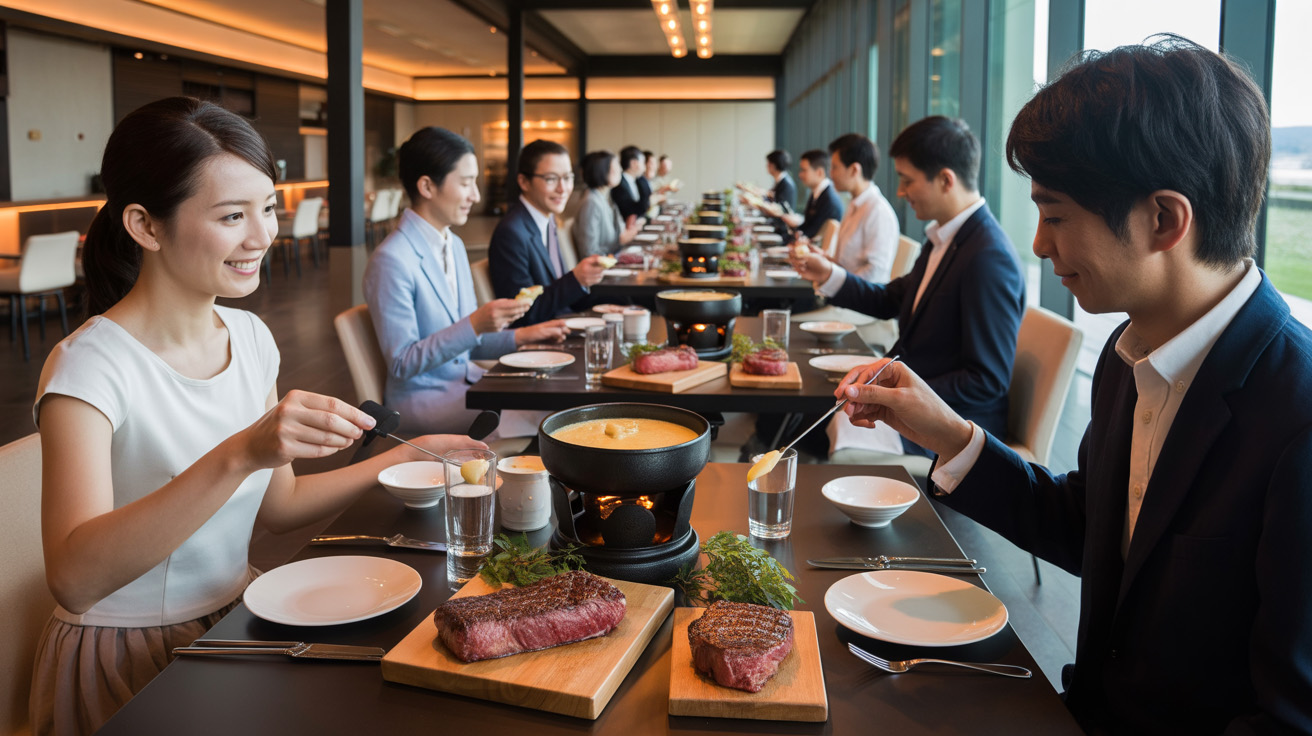 ステーキとチーズフォンデュというライブ感のある料理は、「一緒に何かをする」「同じものを見る・食べる」という共同体験を生み出します。料理に集中する時間や、チーズを絡める動作が、自然とアイスブレイクの役割を果たしてくれるのです。